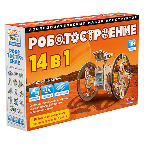 Конструктор Роботостроение 14 в 1. Отправляемся в будущее! Самостоятельно собираем этих невероятных автономных роботов, работающих от экологически чистого и неистощимого источника солнечной энергии. Набор позволяет детям познакомиться с увлекательным миром робототехники, электроники, механики и технологии солнечной энергии, разовьет моторику рук и воображение.