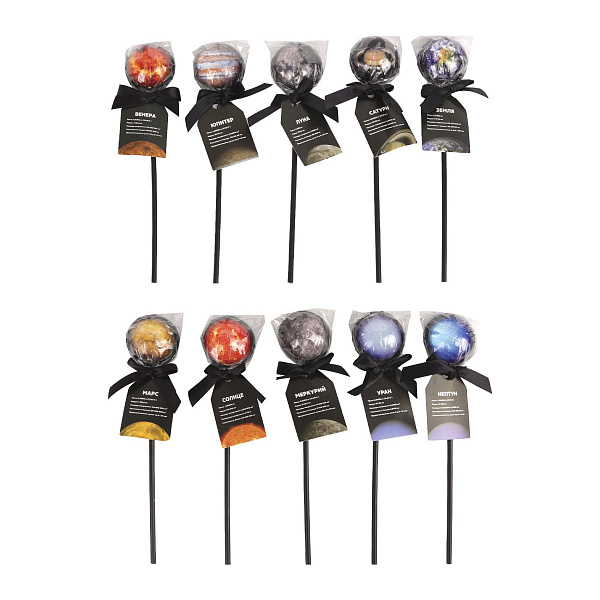 Карамель на палочке «Космос» — это уникальные конфеты, выполненные в виде планет Солнечной системы. Каждая карамель имеет яркий и детализированный рисунок, напоминающий поверхность соответствующей планеты. На каждой карамели закреплен ярлычок с коротким описанием планеты, что делает их не только вкусным, но и познавательным лакомством.