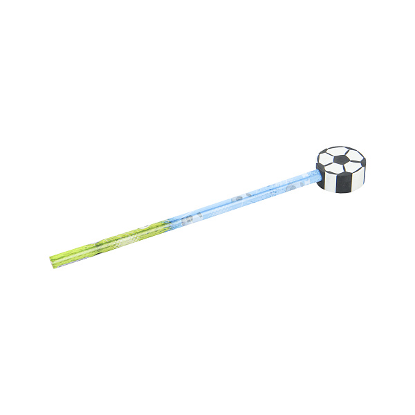 Чернографитный карандаш со съемным полимерным ластиком в форме мяча изготовлен из мягкой древесины и имеет тонкое пленочное покрытие, которое окрашено в стилизацию футбольного поля и летящих мячей. Такой карандаш понравится мальчикам и станет чудесным пополнением комплекта школьных принадлежностей.