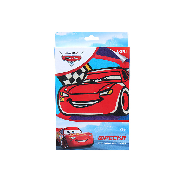 Картины из песка различаются по уровню сложности, поэтому если вы ищете вариант поделки именно для вашего малыша, выбор огромен! Например, достаточно простая и вместе с тем красивая фреска «Тачки», которую под руководством взрослых сможет сделать каждый ребенок. Картина из песка создана на основе мультфильма «Тачка» с главным героем Молнией МакКвином на переднем плане.
