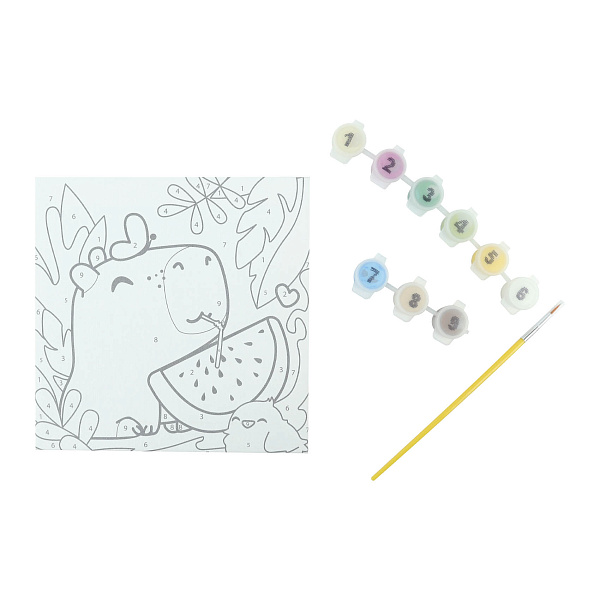 В набор входит основа на холсте с заранее напечатанным изображением капибары, кисть и девять баночек красок разных цветов. Дополнительно ребенку понадобится стакан с водой и защитная скатерть для рисования за столом.