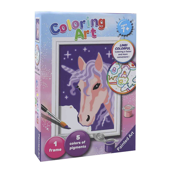 Набор для росписи «Единорог» - это готовая картина в белой рамке размером 14×10 см, на которой изображен очаровательный единорог с фиолетовой гривой на темно-фиолетовом фоне со звездами. Поверхность холста покрыта водостойким лаком с нанесенными цифрами - каждая область соответствует определенному цвету краски. Материалы безопасны: краски на водной основе, нетоксичные, легко смываются с рук и одежды; рамка - прочный пластик, не имеет острых краев. Упаковка яркая, информативная, с примером готового результата и инструкцией по использованию.