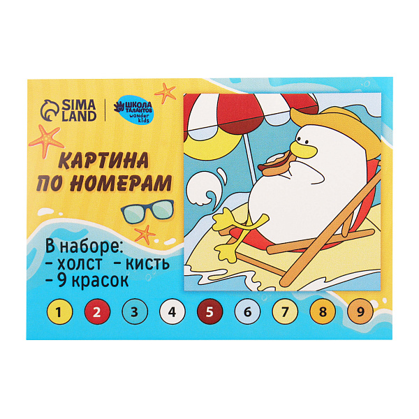 С этим набором для творчества юных художник сможет создать самую настоящую картину с забавной уточкой. На белой основе нанесены контуры рисунка с номерами красок, которыми нужно раскрасить указанное место. Элементы картины достаточно крупные, чтобы ребенок старше 4 лет мог справиться самостоятельно. В комплект входит: холст на подрамнике с шаблоном рисунка, краски 9 цветов, кисть.