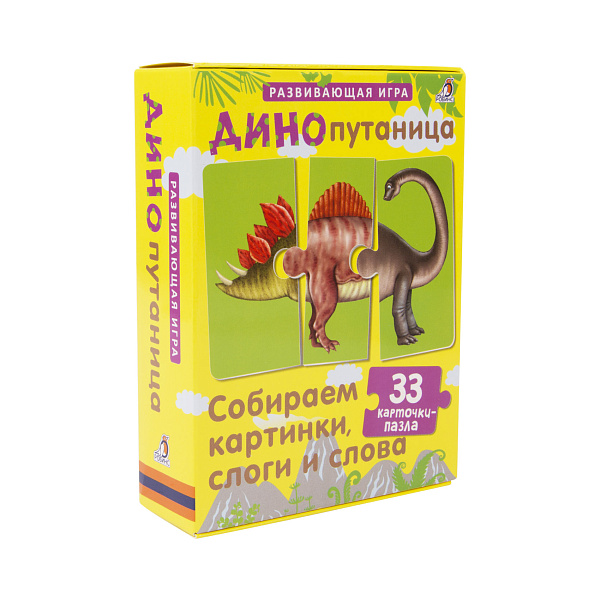 Набор из 33 паззлов «Динопутаница» представляет собой органично подходящие между собой карточки, которые при совмещении по 3 дают изображение известного динозавра. На обратной стороне будет написано название этих видов животных. Особенностью игры является то, что из-за универсальности карточек они подходят и к другим комплектациям. Ребенок может ошибиться или проявить творческую инициативу, и в итоге появится новое, неизвестное науке животное, а на обратной стороне карточки вы сможете почитать его смешное название. Игра в буквы и слова превратится в веселое развлечение, которое разовьет логику, внимание и моторику рук.