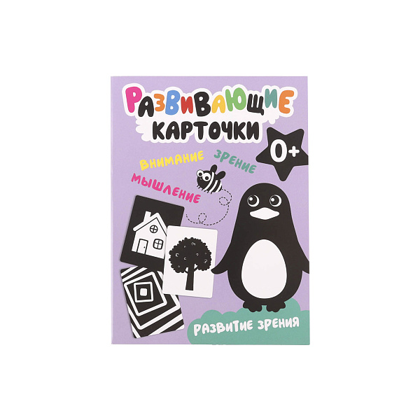 Оригинальный набор из 15 развивающих карточек предназначен для детей с самого раннего возраста. Изображения с фокусирующими зрение узорами на обороте продублированы простыми картинками животных, предметов и растений. Для оформления использована черно-белая палитра.