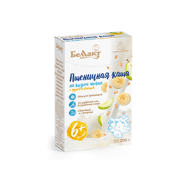 Каша пшеничная на козьем молоке с грушей и бананом подходит для прикорма детей, начиная с 6-месячного возраста. Пшеница богата растительным белком, который легко усваивается и надолго обеспечивает ощущение сытости. В груше есть сахара, клетчатка. А банан содержит калий, витамины С и РР. Большое количество натуральных витаминов группы B в пшенице и груше, а также аминокислота триптофан, содержащаяся в банане, улучшают настроение.