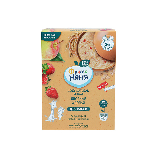 Овсяная каша с клубникой и яблоком предназначена для детей с годовалого возраста. Продукт в виде хлопьев требует варки в течение 2-3 минут, содержит небольшие кусочки для развития жевательных функций. Новое блюдо понравится самым капризным малышам. Оно имеет аппетитный аромат и приятный вкус. Питание содержит много витаминов, микроэлементов и питательных веществ, дает организму необходимую энергию.