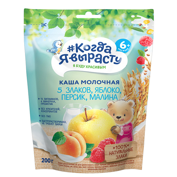 Каша Когда я вырасту молочная 5 злаков яблоко-персик-малина 200г с 6мес БЗМЖ