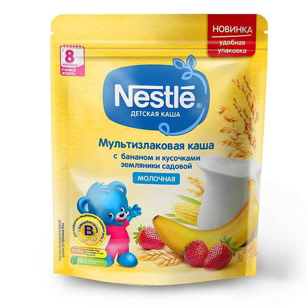 Молочная мультизлаковая каша с бананом и кусочками земляники для питания детей старше 8 месяцев. Каша приготовлена с использованием особой технологии бережного расщепления злаков CHE. Благодаря этому в продукте появляется естественный сладкий вкус, каша лучше усваивается и имеет повышенную пищевую ценность. Каша является полезным сбалансированным прикормом для здоровых детей и отлично подходит для расширения рациона. 5 злаков (пшеница, греча, овес, рис и кукуруза) дополняют друг друга, обеспечивая ребенка питательными веществами. Обогащена пробиотиками - живыми бифидобактериями BL. Они способствуют нормализации пищеварения, росту здоровой микрофлоры и укреплению иммунитета, что очень важно в период введения прикорма. Каша содержит комплекс витаминов и минеральных веществ iRON+ для здорового роста и развития. Добавление фруктовых кусочков (банан и земляника) способствует развитию как вкусовых восприятий малыша, так и жевательных навыков, что очень важно в период постепенного перехода к взрослому меню.