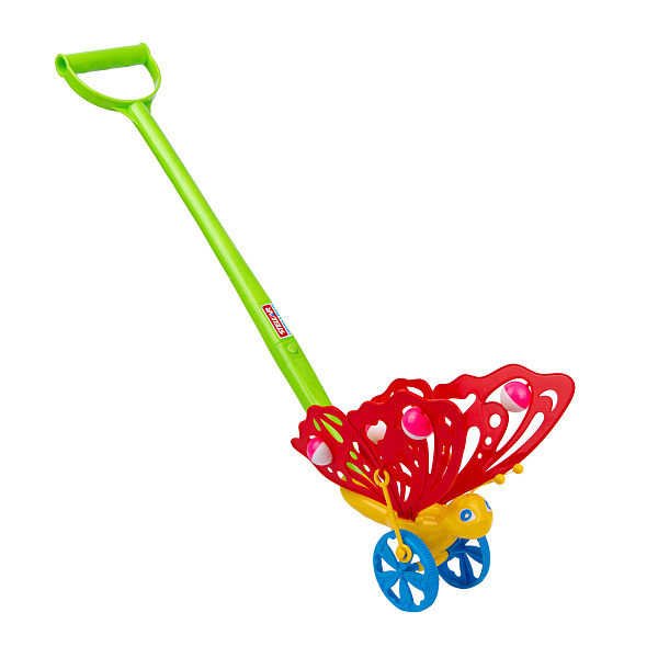 Самостоятельно катать яркую бабочку сможет ребенок годовалого возраста. Движение ярких крыльев и звон шариков порадуют малыша на прогулке или дома. Детей привлекают образы насекомых и животных, а возможность самостоятельно «оживить» игрушку принесет немало радости. Игровая деятельность улучшит координацию движений, научит взаимодействию с предметом, вызовет положительные эмоции, улучшит память и моторику рук. Экологичный пластик имеет безопасный состав, легко отмывается от загрязнений и не опасен для детского использования.