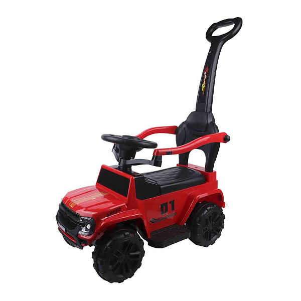 Яркая каталка в форме джипа привлекает внимание. Игрушка оснащена ручкой для родителей и подножками для ребенка. При движении активируются световые эффекты. Звуковые сигналы дополняют игровой процесс. Колеса двигаются плавно. Каталка способствует развитию координации движений. Ребенок может использовать ее для прогулок.