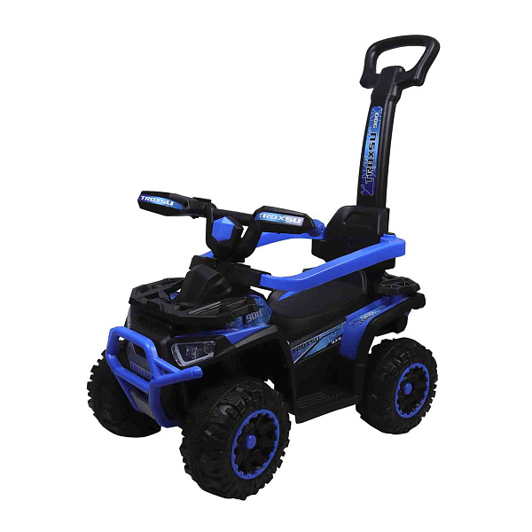 Каталка квадроцикл с ручкой синего цвета выполнена в ярком и привлекательном дизайне, сочетающем насыщенный синий и черный цвета. Спортивный внешний вид с эффектными синими акцентами и графическими элементами делает модель стильной и современной. Эргономичное сиденье и надежные бортики обеспечивают комфорт и безопасность ребенка во время игры.