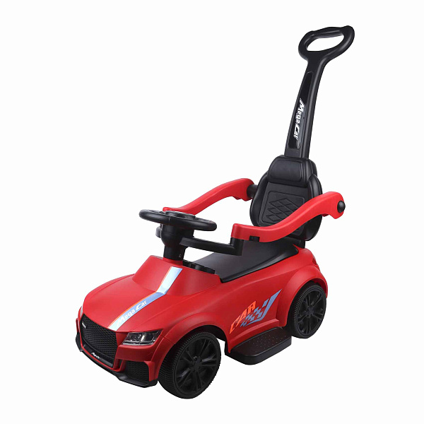 Это яркая и функциональная игрушка для малышей от 1 года, сочетающая в себе каталку, машинку и тренажер для первых шагов. Выполнена из прочного пластика в стиле спортивного автомобиля: основной цвет - насыщенный красный, с черными колесами, рулем, сиденьем и ручкой. На корпусе - декоративные надписи «CAR» и графические элементы, придающие динамичный вид. Большие колеса с рельефным протектором обеспечивают плавное движение по любому полу. Черный руль с имитацией приборной панели позволяет ребенку «управлять» машинкой, развивая мелкую моторику и воображение.