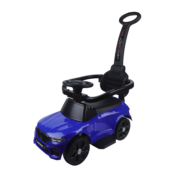 Каталка внедорожник с ручкой выполнен в ярком и привлекательном дизайне, сочетающем насыщенный синий и черный цвета. Спортивный внешний вид с эффектными синими акцентами и графическими элементами делает модель стильной и современной. Эргономичное сиденье и надежные бортики обеспечивают комфорт и безопасность ребенка во время игры.