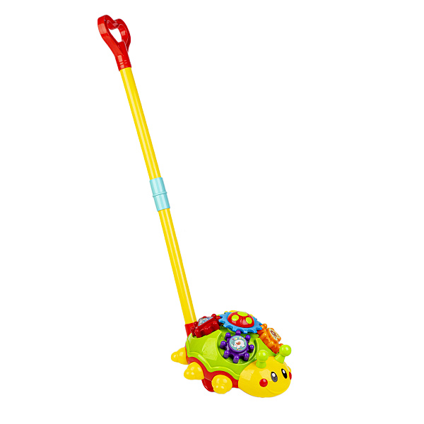 Игрушка выполнена в образе забавной божией коровки ярко-зеленого цвета. На спине у букашки объемные элементы с выпуклыми деталями и изображением животных — изучать новую фактуру полезно для тактильного восприятия, а крутящаяся шестеренка разовьет моторику пальцев. При этом игрушка издает звуки во время движения, чем привлечет малыша – он пойдет следом за игрушкой уверенными быстрыми шагами, разовьет координацию движений и ориентацию в пространстве.