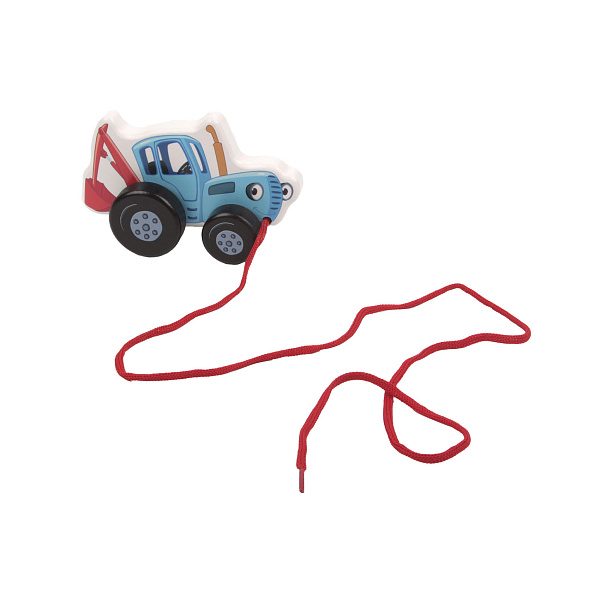 Деревянная развивающая игрушка «Синий трактор» предназначена для самых маленьких детей. Она представляет собой стилизованную модель колесного трактора с красным или желтым шнурком. Возрастных ограничений на использование игрушки нет.