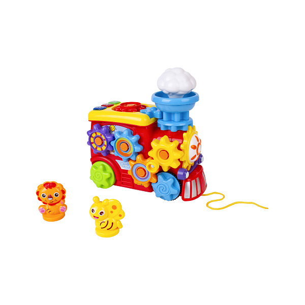 Ребенку доступны звуки животных, пение птиц и приятные на слух мелодии. При прокручивании шестеренок паровозик приходит в движение, так как переднее колесо задействовано в процессе вращения.