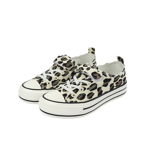 Фоновый цвет полукед – бежевый, подошва – белая. Верх декорирован крупными черными пятнами, в сочетании с фоном получается имитация леопардовой кожи. Такие полукеды хороши для занятий физкультурой и спортом, уличных прогулок.