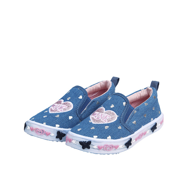 Текстильные кеды PASITO станут верным другом для активных и любознательных малышек. Мягкая джинсовая ткань выполнена из приятного на ощупь текстиля, который обеспечивает естественную вентиляцию и дарит комфорт ногам в течение носки. Застежек на обуви нет, а фиксируется на ноге она с помощью резинки. Новок украшают декоративные сердечки, они добавляют нежности и мечтательности в летний образ. Подошва изготовлена из ПВХ – легкого материала, который не утяжеляет ногу, устойчив к нагрузкам и износу.