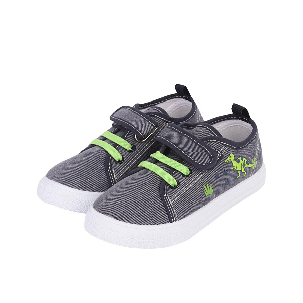 Окраска верха выполнена под джинсовую ткань, подошва – белая, шнурки – зеленые.