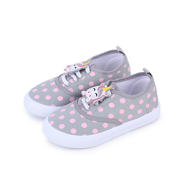Кеды для девочек — это сочетание удобства и модного дизайна. Серый цвет с розовыми горошинами и декоративной фигуркой единорога придают обуви оригинальный вид, идеально подходящий для активных игр и прогулок.
