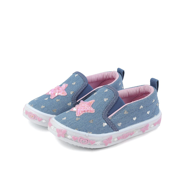 Детские кроссовки представлены в стиле деним с розовыми деталями и мерцающими звездочками на верхней части. Отличительной особенностью обуви является светящаяся подошва с разноцветными светодиодами, создающая впечатляющие визуальные эффекты при каждом шаге. Материал верха обуви составляет 80% текстиля и 20% полиэстера, что обеспечивает прочность и комфорт. Подошва изготовлена из ПВХ, что гарантирует хорошее сцепление с поверхностью и износостойкость.