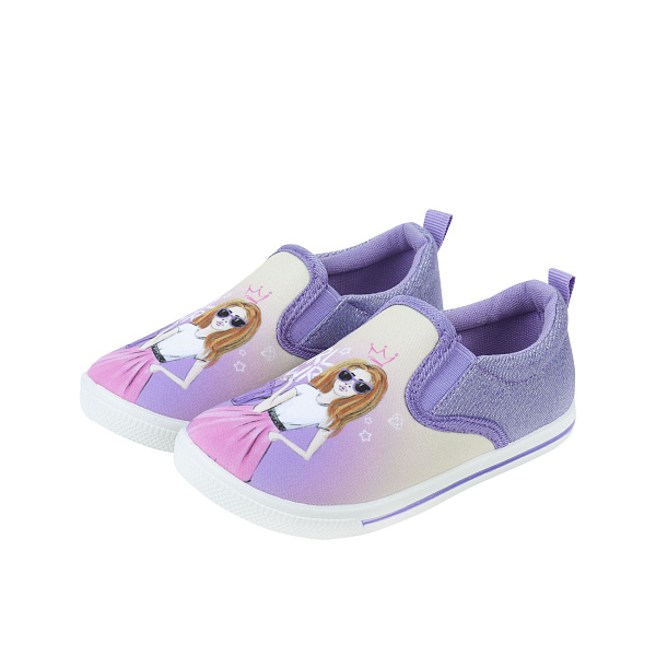 Легкие и удобные кеды для девочек на лето в сиреневом оттенке. Это оригинальная модель, у которой спереди напечатано изображение современной модной девчонки, а для задника использовался мягкий материал с бесящими нитями. Для комфортной носки у ботинок по бокам установлены две резинки.