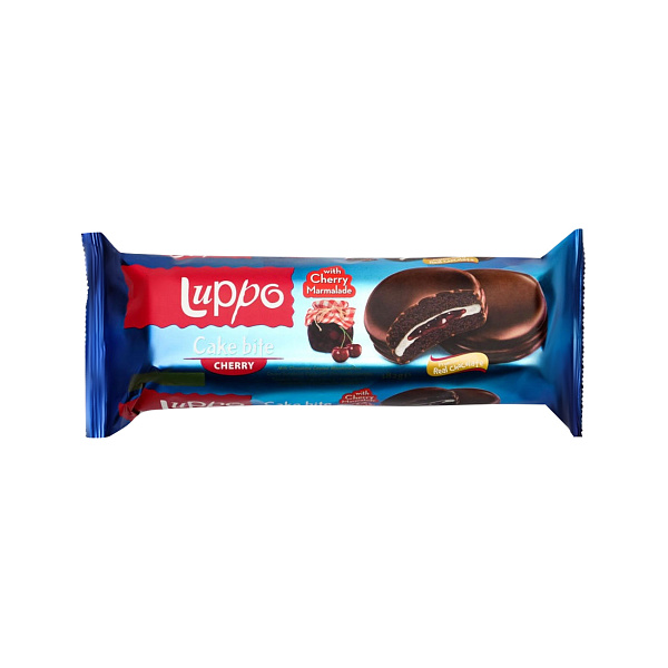 Кекс Luppo сендвич создан для приятного чаепития. Вкусный и нежный десерт состоит из ароматного шоколадного бисквита, мармеладного джема со вкусом вишни, воздушного маршмеллоу и покрыто тёмным шоколадом.