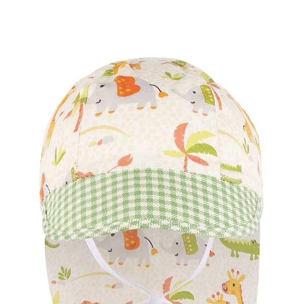 Головной убор для мальчика выделяется оригинальной конфигурацией. Традиционный козырек дополнен небольшой накидкой в задней части изделия. Она плавно спускается на спину, защищает кожу ребенка от солнечных ожогов. Модель оформлена с использованием сочных цветов, украшена изображениями обитателей африканского континента. Кепи создает комфортные условия для прогулки в самый жаркий день, исключает тепловой удар.