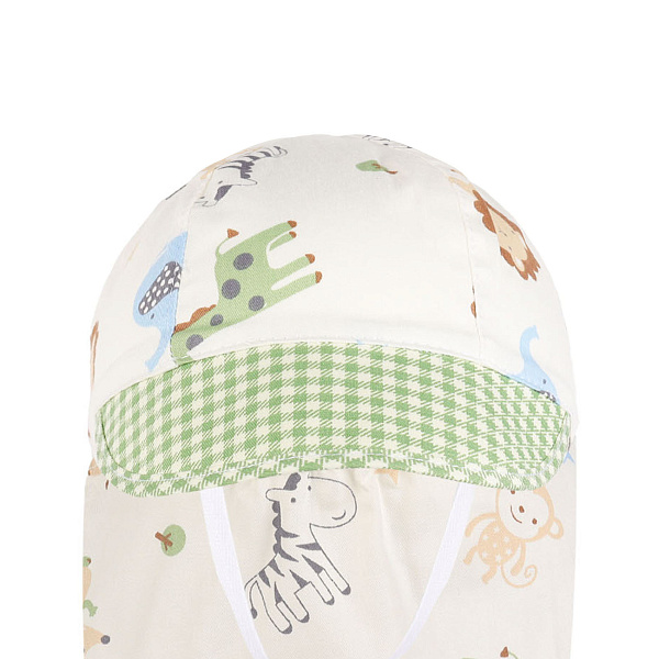 Оригинальный головной убор для ребенка создан с учетом его базовых потребностей, поэтому станет полезным дополнением летнего гардероба. Модель с козырьком дополнена ниспадающей деталью в задней части для защиты шеи от солнечных лучей. Фигурный крой гарантирует комфортную посадку. Для фиксации кепки предусмотрены текстильные шнурки. Для оформления выбрана спокойная цветовая гамма и изображения разных животных.