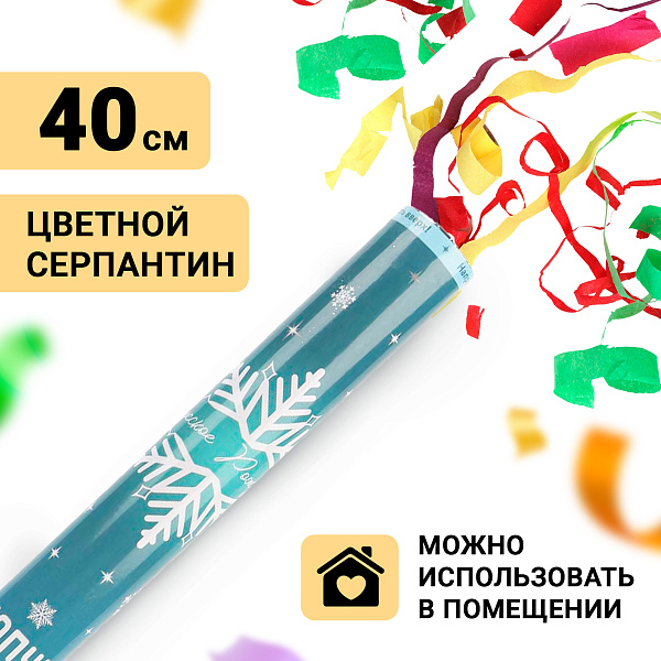 Пневматическая хлопушка с серпантином — отличный способ украсить праздник. Длина изделия составляет 40 см, что позволяет создать яркий эффект, запуская разноцветные ленты. Хлопушка выполнена в современном дизайне — ее корпус окрашен в насыщенный синий цвет и украшен снежинками, создавая атмосферу зимнего праздника.