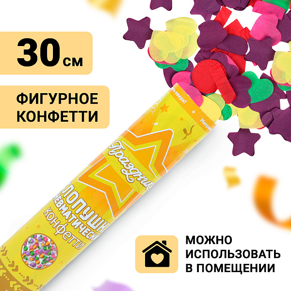 Хлопушка с фигурным разноцветным конфетти — это яркое и веселое украшение для любого праздника. Разноцветные бумажные фигурки в форме сердечек, звездочек и кружочков взлетают в воздух, наполняя пространство радостью и праздничным настроением. Каждый выстрел хлопушки создаёт живую и красочную сцену, которая покорит гостей и сделает событие незабываемым.