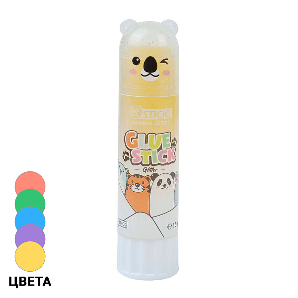 Клей-карандаш с блестками отличается ярким и забавным дизайном с изображением милой зверюшки на корпусе. Форма тубы классическая, удобная для удержания, а колпачок стилизован под голову животного с ушками, что придает изделию игривость и делает его привлекательным для детей.