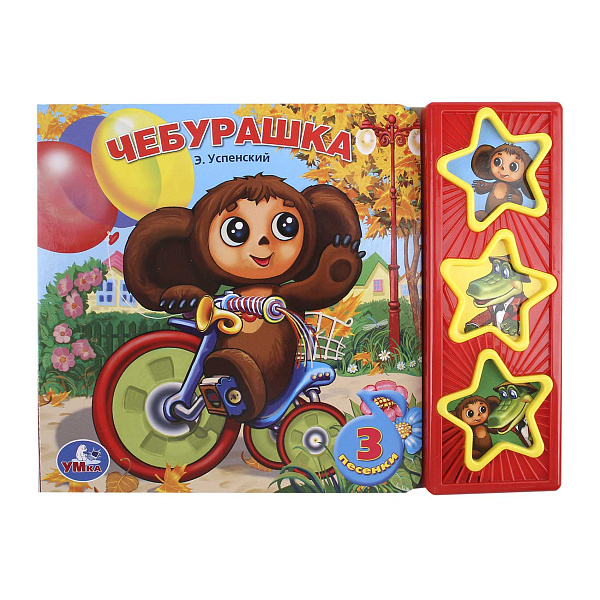 Эта озвученная книга о Чебурашке привлекает внимание яркими иллюстрациями и интересными песенками. Обложка книги выполнена в насыщенных цветах, изображает Чебурашку на велосипеде, что создает атмосферу радости и приключений. На обложке размещены кнопки в форме звездочек, которые позволяют маленьким читателям наслаждаться музыкальным сопровождением.