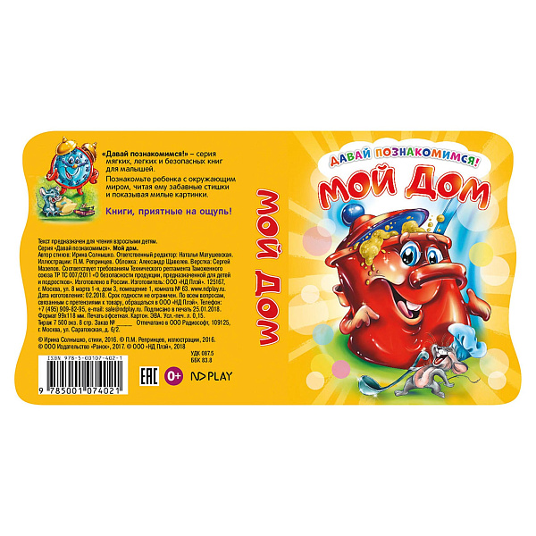 Развивающие книги для малышей с мягкими страницами, яркими картинками и короткими стишками из специального особо прочного материала EVA, ведь юные читатели так любят все пробовать на вкус! Книги из серии «Давай познакомимся» приятные на ощупь, легкие, красивые, а их страницы так удобно листать. Первые книги малыша познакомят ребенка с окружающим миром, природными явлениями, предметами. Внутри каждой книги для малышей – детские стихи: короткие, благозвучные и такие забавные – их можно учить вместе с взрослыми. У предметов и зверушек есть глазки, носики и ротики, они представляются и рассказывают о себе. Картинки в книгах для малышей яркие и крупные, их можно рассматривать вновь и вновь, они привлекают и удерживают внимание. Книги для малышей имеют компактный размер: их удобно брать с собой на прогулку или в путешествие, они легко поместятся в небольшую сумку. Замечательная идея для подарка маленькому ребенку от 1 года. Книги из полимерного и нетоксичного материала EVA, разработанного специально для самых юных читателей.