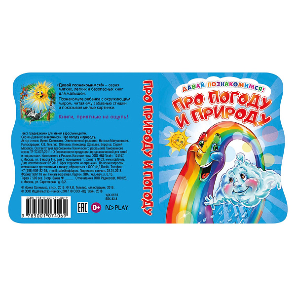 Развивающие книги для малышей с мягкими страницами, яркими картинками и короткими стишками из специального особо прочного материала EVA, ведь юные читатели так любят все пробовать на вкус! Книги из серии «Давай познакомимся» приятные на ощупь, легкие, красивые, а их страницы так удобно листать. Первые книги малыша познакомят ребёнка с окружающим миром, природными явлениями, предметами. Внутри каждой книги для малышей – детские стихи: короткие, благозвучные и такие забавные – их можно учить вместе с взрослыми. У предметов и зверушек есть глазки, носики и ротики, они представляются и рассказывают о себе. Картинки в книгах для малышей яркие и крупные, их можно рассматривать вновь и вновь, они привлекают и удерживают внимание. Книги для малышей имеют компактный размер: их удобно брать с собой на прогулку или в путешествие, они легко поместятся в небольшую сумку. Замечательная идея для подарка маленькому ребенку от 1 года. Книги из полимерного и нетоксичного материала EVA, разработанного специально для самых юных читателей.