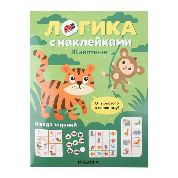 Книга предлагает выполнение различных заданий с наклейками, что способствует развитию координации и внимания. Дети могут решать задачи, используя наклейки, которые легко приклеиваются и снимаются.