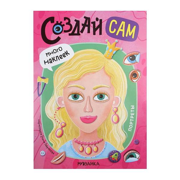 Книга «Создай сам: Портреты» — это творческий набор для создания уникальных образов с помощью наклеек. Внутри представлены страницы с пустыми лицами и большая коллекция наклеек с частями лица, которые можно по своему вкусу наклеивать на страницы.