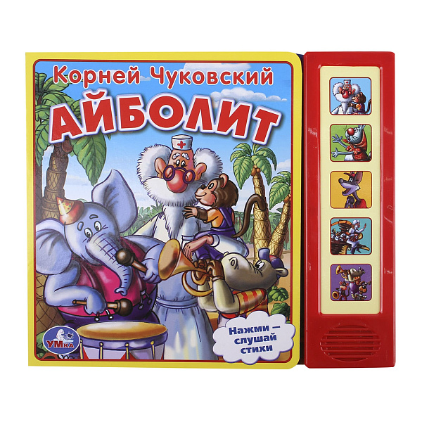 Озвученная книга «Айболит» — это увлекательное издание с яркой обложкой, на которой изображен добрый доктор Айболит и его звериные пациенты.