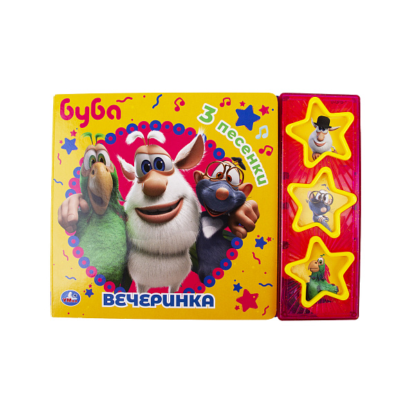 Книга «Буба. Вечеринка» – веселый рассказ о приключениях известного мультипликационного героя и его друзей. Три зажигательных песни, которые можно прослушать, нажав на звездочки, дополняют атмосферу прочитанного. Яркость художественно-литературного издания удивляет – красочные иллюстрации переносят ребенка прямо в мир книги. Модуль звука работает от трех батареек типа LR44, которые предусмотрены в комплекте. Материалы: картон, пластик, электронный модуль. Во избежание порчи электромодуля книгу следует хранить в сухом месте.