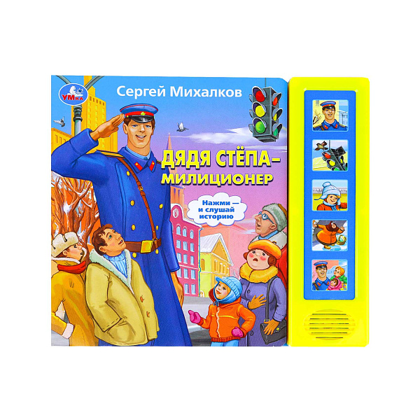 Озвученная книга «Дядя Степа» – известная сказка Сергея Михалкова с нетрадиционной подачей. Сбоку встроено 5 кнопок, которые озвучивают историю. Нажимая на них поочередно, можно прослушать сказку целиком. Яркие иллюстрации, дополняющие рассказ, точно понравятся любителям увлекательных историй. Материалом для изготовления стал плотный картон, поэтому страницы могут легко переворачивать даже маленькие детские ручки. Озвученная книга в твердом переплете развивает память, моторику рук, зрительное и слуховое восприятие малыша, а также воспитывает в нем усидчивость и внимание. Предназначено для детей с первых дней жизни.