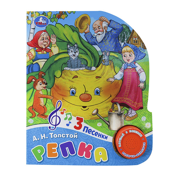 Книга «Репка» А. Н. Толстого — это яркая озвученная книжка с изображением всей семьи, тянущей репку, и крупной улыбающейся репкой на обложке, содержащая три песенки по мотивам сказки, которые помогают малышу запомнить сюжет и героев.