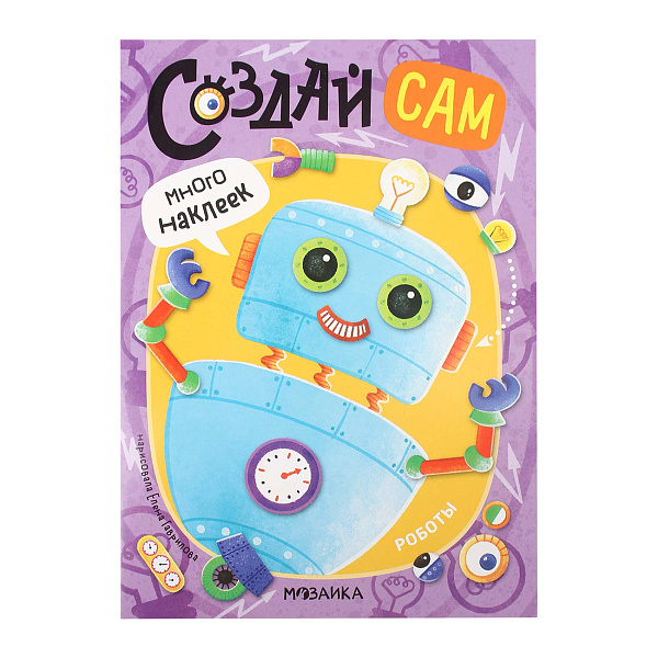 Книга «Создай сам. Роботы» — это набор страниц с яркими рисунками и множеством наклеек, из которых можно собирать разных роботов. Наклейки представлены в виде разных элементов роботов.