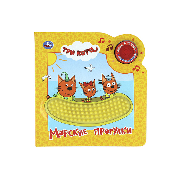 Музыкальная книга «Морские прогулки. Три кота» основана по мотивам одноименного мультипликационного фильма. Три песни (Море, Три кота и Зарядка) посвящены приключениям знаменитых героев Коржика, Карамельки, мамы Кисули, папы Коти. История окунет ребенка в морское приключение с главными героями, научит их доброте, состраданию, а также разовьет зрительную и слуховую память. Выполнена книга при использовании следующих материалов: картон, пластик, электронный модуль с озвучкой. Звуковой модуль работает от 3 батареек типа LR1130.