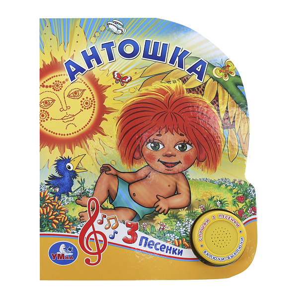 Книга «Антошка» — это яркая и интерактивная озвученная книжка с изображением веселого мальчика с рыжей шевелюрой, сидящего на фоне солнца, подсолнухов и птички. На обложке крупными буквами указано название, а внизу — красный музыкальный символ и надпись «3 песенки». Справа расположен круглый желтый громкоговоритель с кнопкой, который активирует звук при нажатии, а необычная форма привлекает внимание малыша.