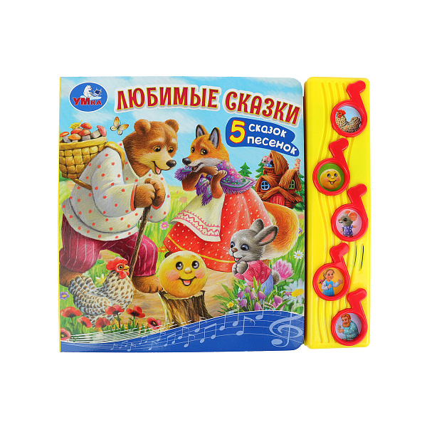 Музыкальная озвученная книга-игрушка «Любимые сказки». Всего в ней записано пять популярных сказок-песенок, которые так любят дети. Чтобы включить запись, малышу достаточно нажать на одну из пяти кнопок справа на лицевой стороне. Нажав второй раз, можно остановить проигрывание песни. Кроме звукового сопровождения, в книге есть и классический текст с красочными иллюстрациями. Послушать сказку перед сном теперь можно как в исполнении родителей, так и из аудиозаписи.