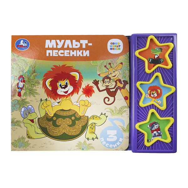 Книга «Мульт-песенки» — это яркая озвученная книжка с изображением любимых героев Союзмультфильма: льва, обезьянки, крокодила Гены и других персонажей на фоне тропического пейзажа. Справа расположен фиолетовый блок с тремя звездочками-кнопками, каждая из которых активирует одну из трех песен — «Голубой вагон», «Кабы не было зимы» и «Песенка про Крокодила». Книга имеет удобную форму для маленьких рук и привлекает внимание ребенка яркими цветами и знакомыми героями.