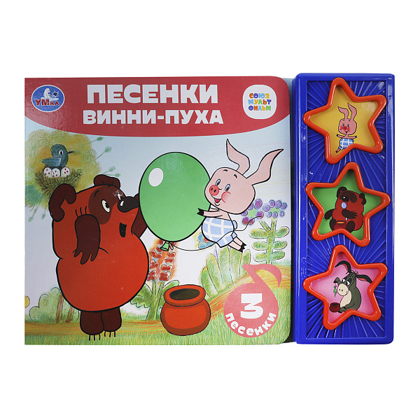 Книга «Песенки Винни-Пуха» — это яркая и интерактивная озвученная книжка с изображением любимых героев мультфильма: Винни-Пуха, Пятачка и Кролика на фоне цветущего луга. На обложке крупными буквами указано «3 песенки», а справа расположен синий блок с тремя звездочками-кнопками, каждая из которых активирует одну из трех песен — «Утренняя песенка», «Песенка про Кролика» и «Песенка про Иа». Книга имеет удобную форму для маленьких рук и привлекает внимание ребенка яркими цветами и знакомыми героями.