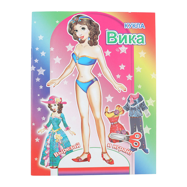 Бумажная кукла Вика понравится девочкам. Размер куклы 210х160 мм. В комплект входит набор одежды и аксессуаров, которые можно вырезать и примерять на куклу. Кукла сделана из плотной бумаги. На страницах есть платья, костюмы, шляпы и украшения. Все детали легко отделяются от листа. Игра с куклой развивает мелкую моторику и воображение.