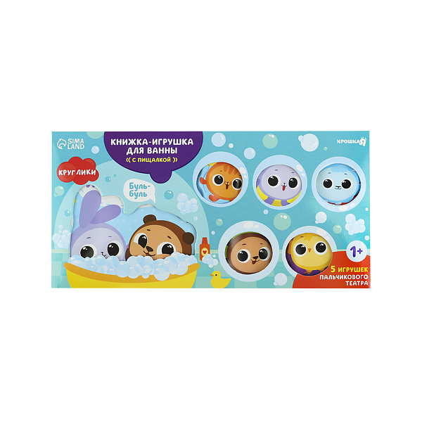 Развлечение для ванны включает в себя пять игрушек для пальчикового театра и книжку-пищалку. Изделие выполнено в ярких цветах с изображениями милых животных, что привлекает внимание ребенка. Книжка с мягкими страницами идеально подходит для игры в воде – она водонепроницаема и плавает на поверхности.